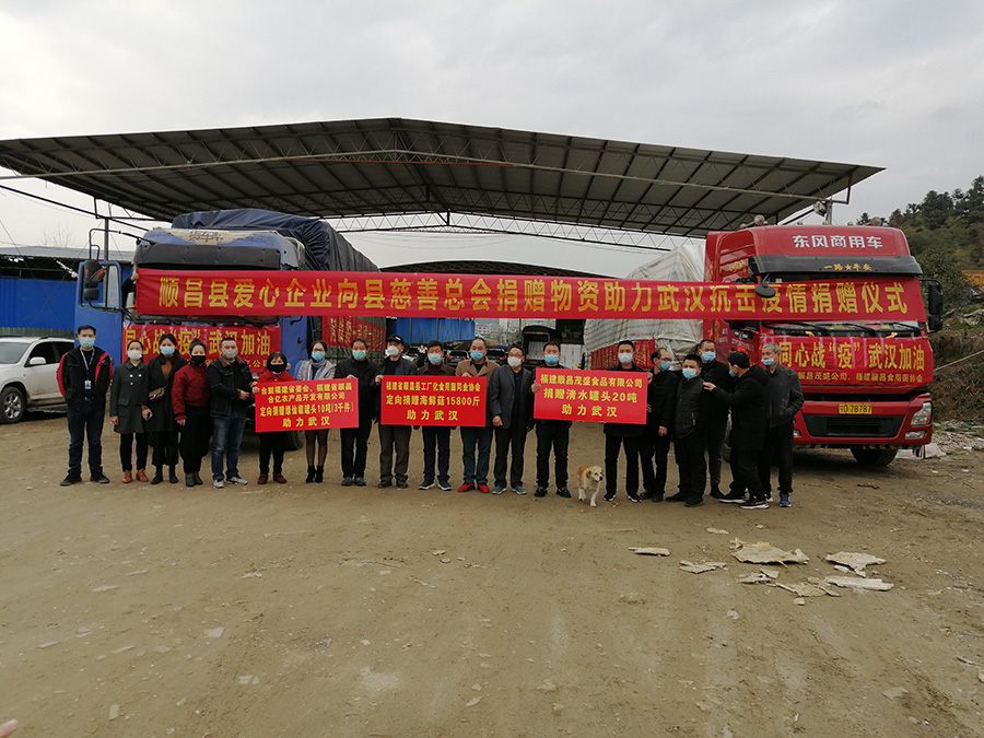 2020年3月6日,福建省順昌縣愛心企業(yè)向縣慈善總會定向捐贈的第二批物資助力武漢捐贈儀式在順昌縣綠通物流舉行。由臺盟福建省委會、福建省順昌合億農產品開發(fā)有限公司捐贈的綠仙椒罐頭10噸(3千件)、福建順昌茂盛食品有限公司捐贈的清水罐頭20噸、福建省順昌縣工廠化食用菌同業(yè)協(xié)會捐贈的海鮮菇18800斤等物資帶著順昌人民與武漢人民共克時艱、共抗疫情的深情厚意無償馳援武漢。