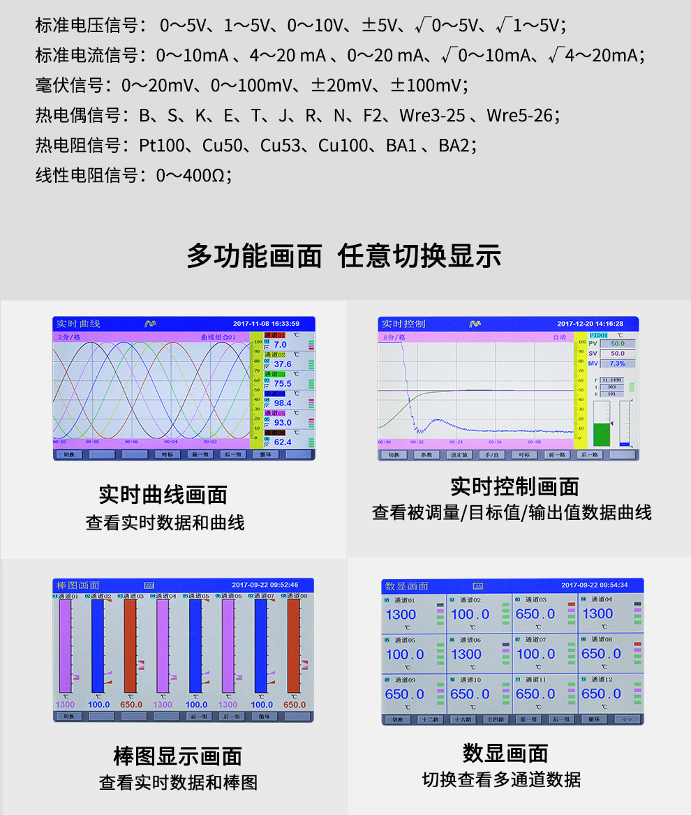 OHR-H300系列彩色調(diào)節(jié)無紙記錄儀采用真正的人工智能算式,儀表啟動自整定功能,可根據(jù)被控對象的特性,自動尋找最優(yōu)參數(shù)以達(dá)到很好的控制效果,無需人工整定參數(shù)。控溫精度基本達(dá)±0.1℃,無超調(diào)、欠調(diào),達(dá)國際先進(jìn)水平。24路萬能輸入(可組態(tài)選擇輸入:標(biāo)準(zhǔn)電壓、標(biāo)準(zhǔn)電流、熱電偶、熱電阻、毫伏等)其中可帶8路控制輸入。