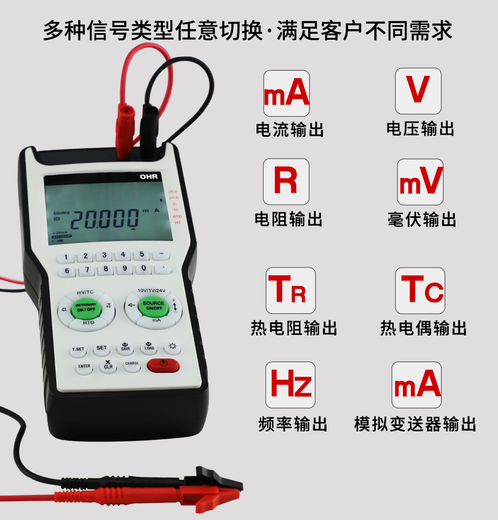 OHR-B00信號發(fā)生器是一種多功能、高精度的便攜式信號源,可用于輸出各種規(guī)格的工業(yè)信號,支持電流、電壓、電阻、頻率、熱電偶、熱電阻等多種信號輸出類型,最高精度可達(dá)0.01%F.S,是工業(yè)現(xiàn)場、實(shí)驗(yàn)室以及各類儀表制造商必備的計(jì)量測試工具。